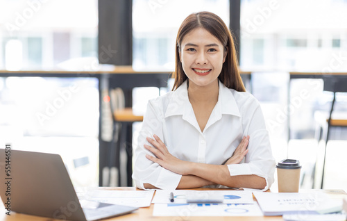 Asian Businesswoman Using laptop computer and working at office with calculator document on desk, doing planning analyzing the financial report, business plan investment, finance analysis concept.
