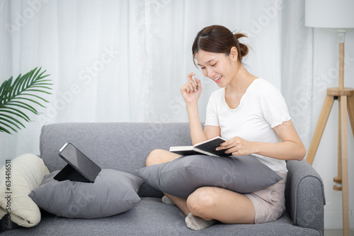 Asian Businesswoman VDO Call Conference Work  talk chat online video call on laptop webcam conference working with laptop online briefing E learning and social distancing concept.