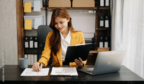 Asian businesswoman working in the office with working notepad, tablet and laptop documents