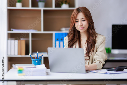 Asian businesswoman working on laptop computer and graph planning a strategy in modern office, Asian woman doing analyzing the financial report, business plan investment, finance analysis concept