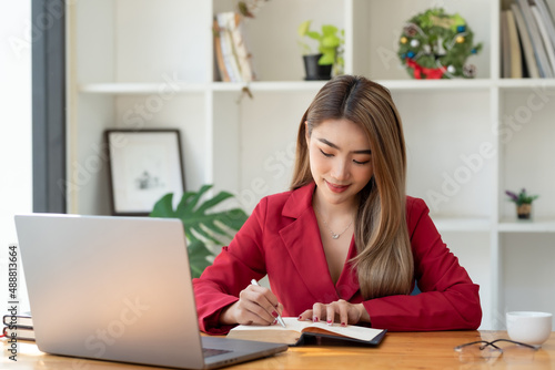 Asian businesswoman writing making list taking notes working or learning on laptop computer in the office.