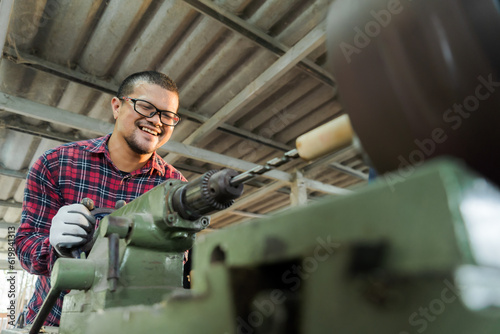 Asian carpenter wearing glasses A plaid shirt cricketer uses a large drill to drill wood. to make snooker sticks have a happy face