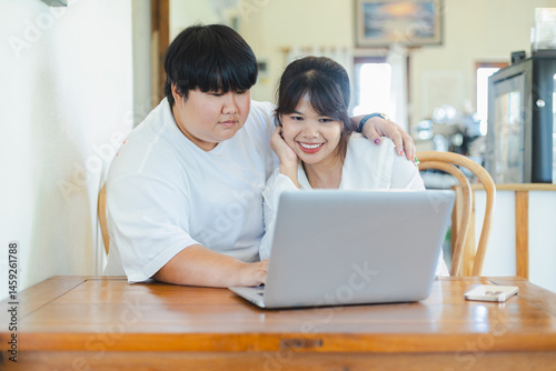 Asian couple using laptop together at home enjoying activity and lifestyle with love and support