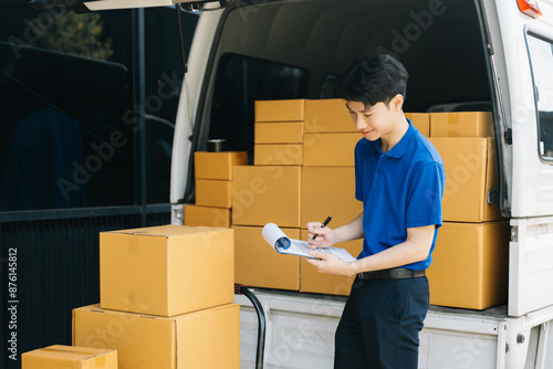 Asian courier delivery man searching the address on digital tablet. near van outside the warehouse. This is a freight transportation