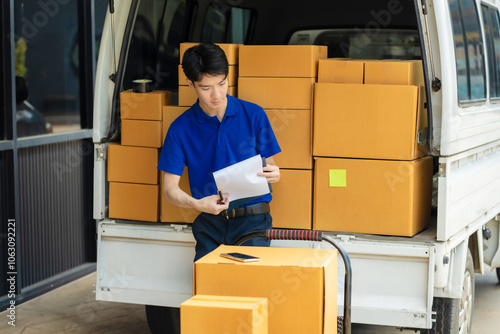 Asian delivery man work in truck for checking the product in the truck, concept ecommerce.