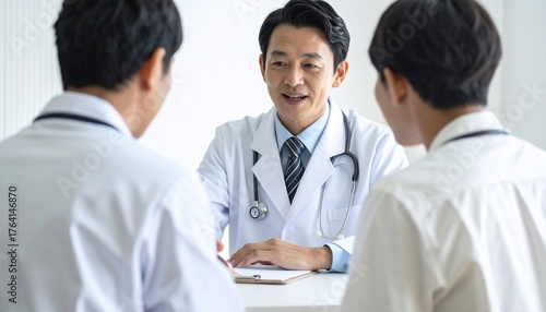 doctor, medicals, health care, clinic, consultation, patient, asian, japanese, korean, office, white coat, stethoscope, discussion, talking, explaining, advice, treatment, health, wellness, hospital, professional, adult, man, male, two people, indoor, bright, modern, meeting, communication, conversation, smiling, cheerful, support, well-being, care, check-up, exam, human relationships, trust, teamwork, positive, friendly, assistance