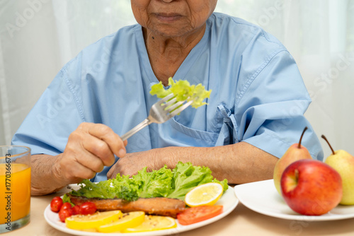 Asian elderly woman patient bored with food, anorexia loss of appetite.