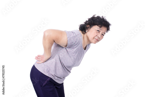 Asian elderly woman with a sick back, backache, isolated on a wh
