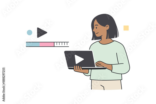 female, adult, laptop, online, video, asian, smiling, technology, streaming, cyberspace, digital, modern, multimedia, casual attire, illustration, app, user, interface, website, entertainment, playback, pause, video, loading, progress, content, browsing, connection, wireless, avatar, cartoon, person, woman, media, player, relaxing, leisure, monitor, graphic, animation