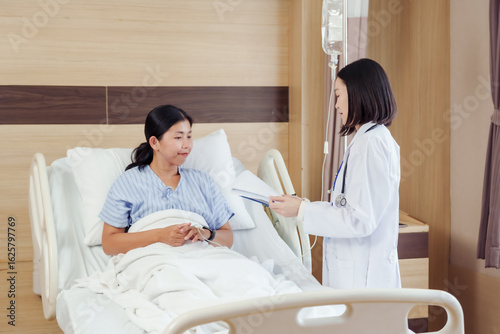 Asian female doctor standing beside hospital bed explaining diagnosis and treatment plan to female patient lying with IV drip inside modern hospital room