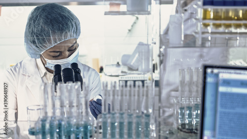 Asian female doctor working with biohazardous samples. Using microscope in futuristic laboratory