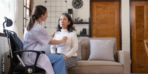 Asian female patient undergoing health check up while female doctor uses stethoscope to check heart rate in nurse, health care concept