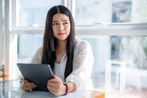 asian freelance people business female wearing smartwatch talking making using casual working with tablet for browsing internet, chatting and blogging and smartphone,notebook in coffee shop.