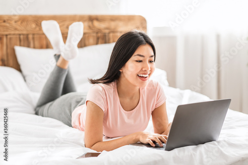 Asian Freelancer Girl With Laptop Working Online Lying In Bed