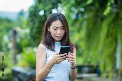 asian, thai, girl, lady, woman, relax, lifestyle, mobile phone, checking, social, garden, read, text, news, face, time, video, call, take, photo, talk, mobile, hold, happy, enjoy, day