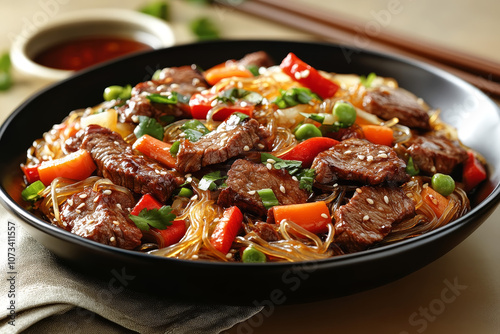 Asian Glass Noodles Stir-Fried with Beef and Fresh Vegetables in Rustic Bowl