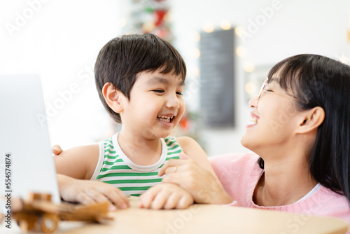 Asian little lovely boy learning or studying at home with his mother.