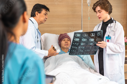 Asian man cancer patient visiting young female doctor for medical consultation in clinic. male patient struggling with cancer, healthcare. Medicine concept.Female doctor explaining xray to patient.