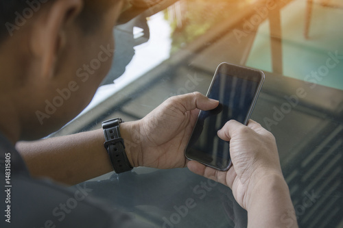 Asian man holding mobile phone sitting at the grass table, close up male finger touching on screen of mobile phone