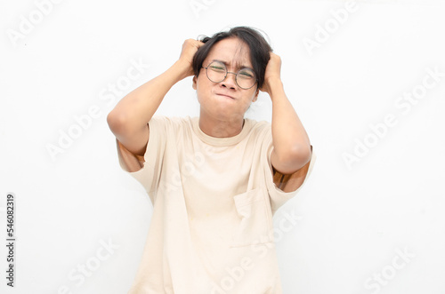asian man looks depressed and messed up. Irritated man bites lips and scratches head. stressed over work concept.