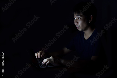 Asian man using laptop in the black dark room and show surprise something on his face