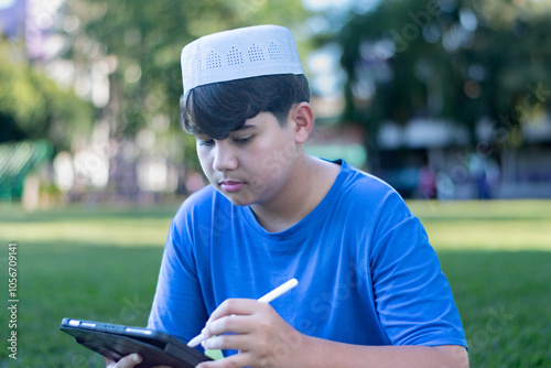 Asian muslim or islamic boy in blue t-shirt sitting on grass and writing something on his laplet, soft focus.
