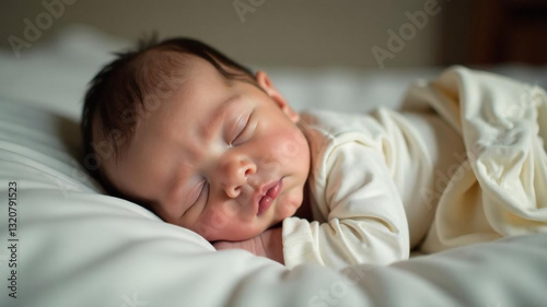 Asian newborn baby sleeping on the bed