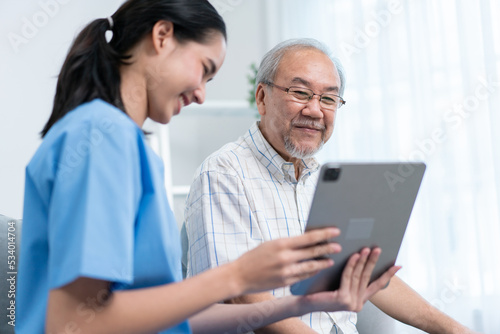 Asian nurse showing health checkup report to grandfather and giving advice. medical assisted living visit senior patient at home. Home nursing and healthcare caregiver concept
