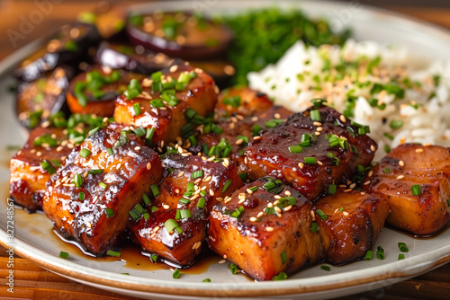 aubergine, pork meat, rice, chives, sesame seeds, plate, food, delicious, asian, cookery, savoury, glazed, meat, dinner, epicure, culinary, meal, dish, flavorful, homemade, garnish, tasty, dining, cooked, rich, sauce, sweet, soy, fresh, appetising, eatery, closeup, accessing, plated