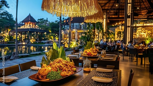 Asian restaurant, outdoor dining, tropical resort, sunset, delicious food