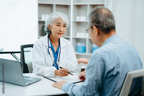 Asian Senior Doctor and patient discussing something while sitting at the table . Medicine and health care concept.