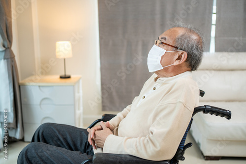 Asian Senior old male wear face mask, sit alone on wheelchair in house.