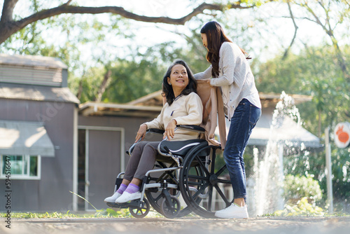 Asian senior woman in wheelchair with happy daughter. Family relationship retired woman sitting on wheelchair in the park age care at retirement home.
