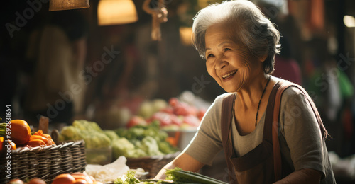 Asian senior woman selling her fruits and vegetables. Generative AI.