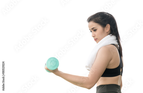 asian sporty young woman with dumbbells isolated