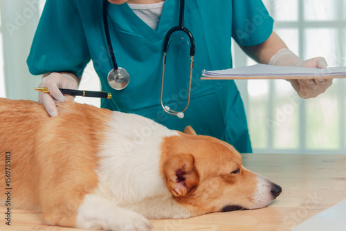 Asian veterinarian examines Corgi dog at clinic, using stethoscope and laptop and clipboard to record information for next appointment. Veterinarian concept.