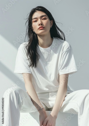 natural, clean, colours, clothing, shadow, asian, light, shirt, white, photo, body, photo, product, effect, people, dais, apparel, simple, blank, human, face, hair, head, set, to sit, against, wearing, all, illumination, professional, black hair, commercial, global, studio, style, image, full, photorealistic, grading, high-end, photograph