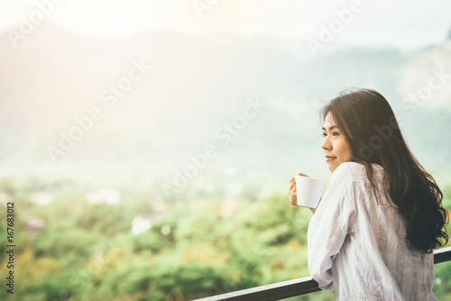 Asian woman drinking a cup of coffee and enjoy nature view in morining with sunlight
