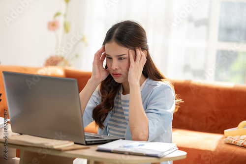 Asian Woman Experiencing Stress While Working on Laptop at Home