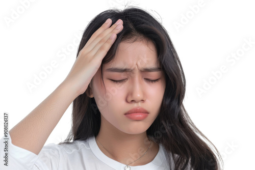 Asian woman feeling headache, eyes closed, hand on forehead, isolated on white background