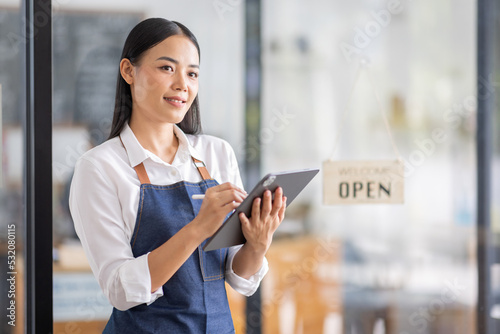 Asian woman is a waitress in an apron, the owner of the cafe stands at the door with a sign Open waiting for customers. Small business cafes and restaurants concept,