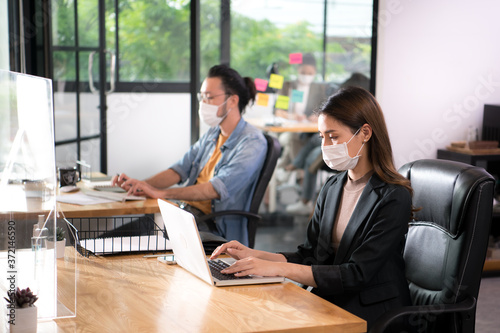 Asian woman office worker wearing face mask working in new normal office and doing social distancing during corona virus covid-19 pandemic