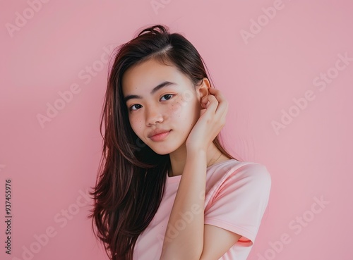 woman, asian, portrait, pink, background, female, model, fashion, beauty, hair, face, smile, eye, skin, studio, photo, posing, casual attire, shirt, freckle, 1, person, young, adult, girl