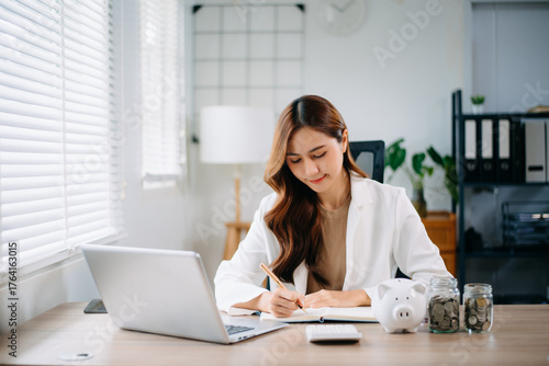 accounting, savings, finance, businesswoman, investment, budget, economy, money box, entrepreneur, accountant, small business, asian woman, personal finance, income, expense, profit, analysis, calculating machine, planning, startup, success, strategy, paperwork, wealth, productivity, self employed, corporate, documentation, bank