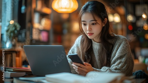 portrait, asian, female, student, smartphone, laptop, prepare, university, graduation, focused, determined, working, preparation, bright, organised, study, space, woman, both, immersed, work, surrounded, textbook, note, descent, engaged, organizing, detail, upcoming, preparing, cosy, area, multitask, academic, material, calendar, modern, workspace, plan, seated, desk, notebook, stationery, focusing, cluttered, book