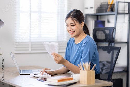 asian woman using calculator and calculate bills in home office. tax form us business income office Financial document. Tax time.Tax concept.