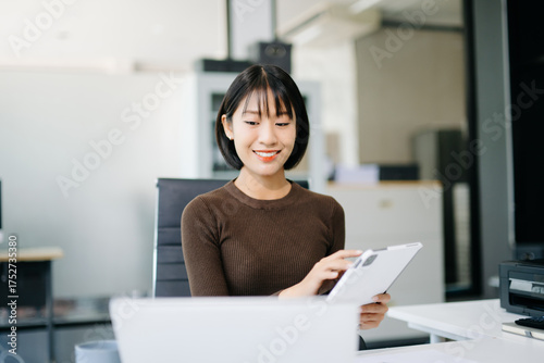 Asian woman using laptop and tablet while sitting at her working place. Concentrated at work. in office