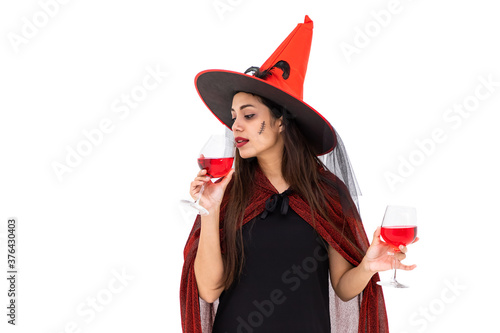 Asian woman wearing Halloween costume as witch in red cloak, on white background, holding glass and drinking red wine, looking at camera
