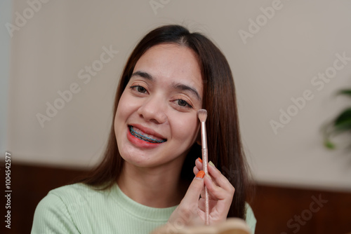 Asian woman with braces uses a makeup brush to apply eyeshadow. Calm and happy expression indicates comfort and focus on self-care. Soft lighting adds a peaceful tone to the image.