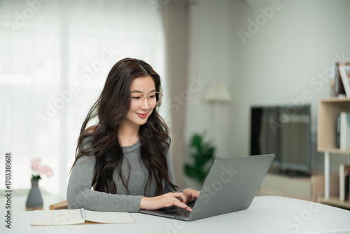 Asian Woman with Long Dark Hair Working on Laptop at Home Office in Bright and Modern Workspace with Plants and Natural Light